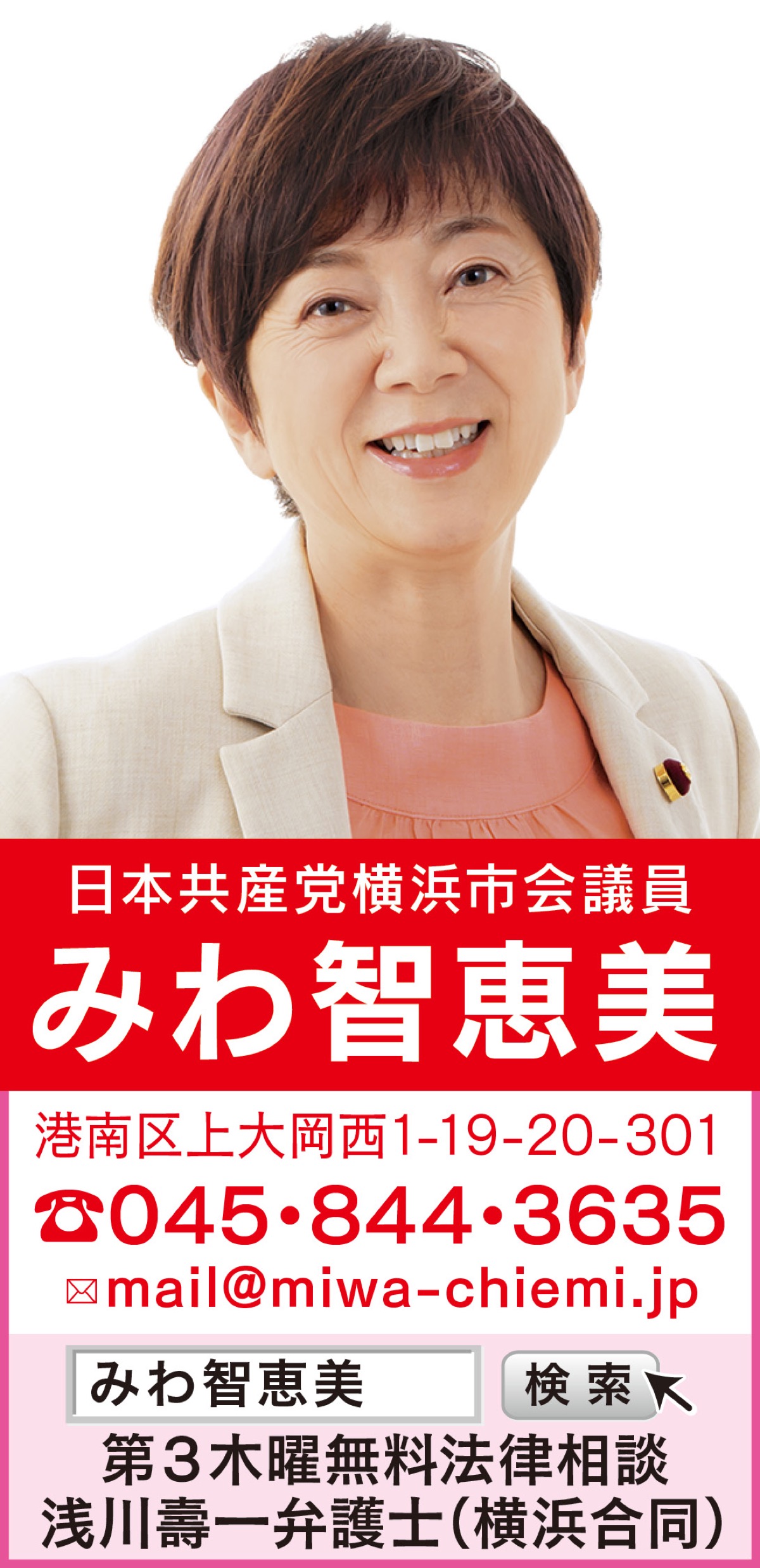 みわ智恵美は一般質問に立ち、マイナ保険証問題や「平和でこそミナトは栄える」とノース・ドックの早期全面返還、デリバリー方式による中学校給食の問題点を取り上げました。市長は、マイナ保険証について「国の動きを注視しつつ、適正に保険診療を受けられるよう準備を進める」と答弁しました。