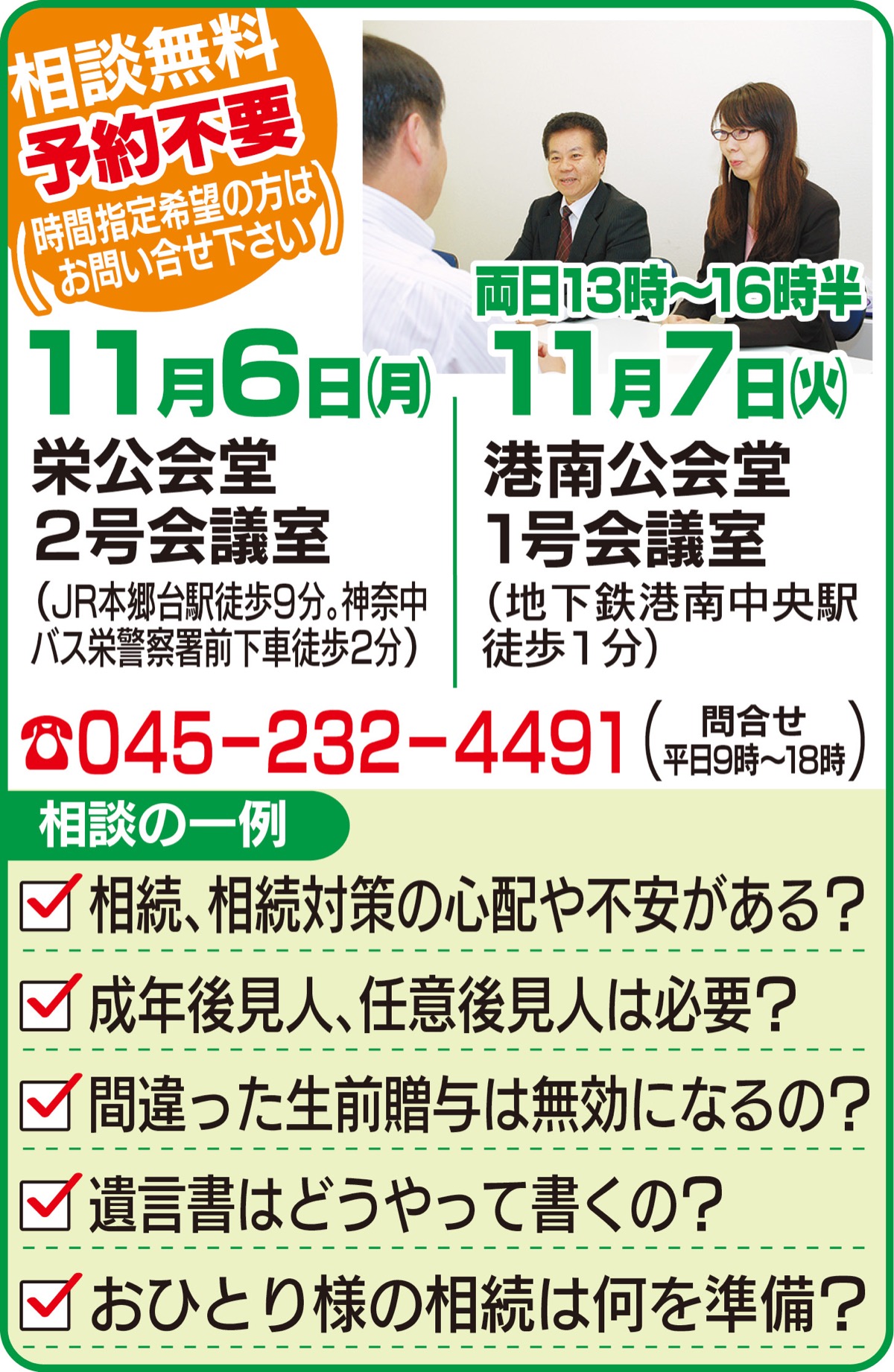 行政書士や社団法人代表など相続の専門家による遺言書、後見人、相続対策、贈与、不動産など相続全般に関わる無料個別相談会が開催される。横浜市民 相続 遺言 贈与相談センターの主催。