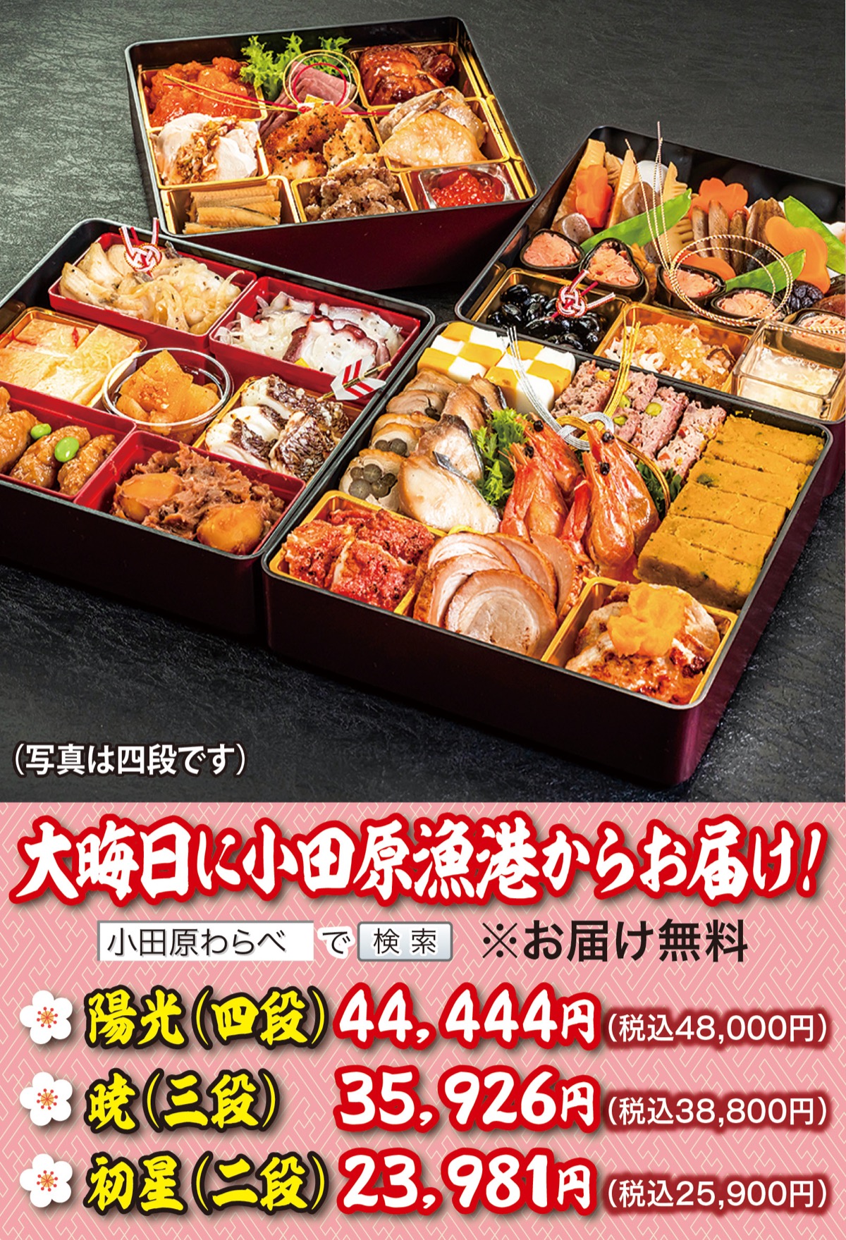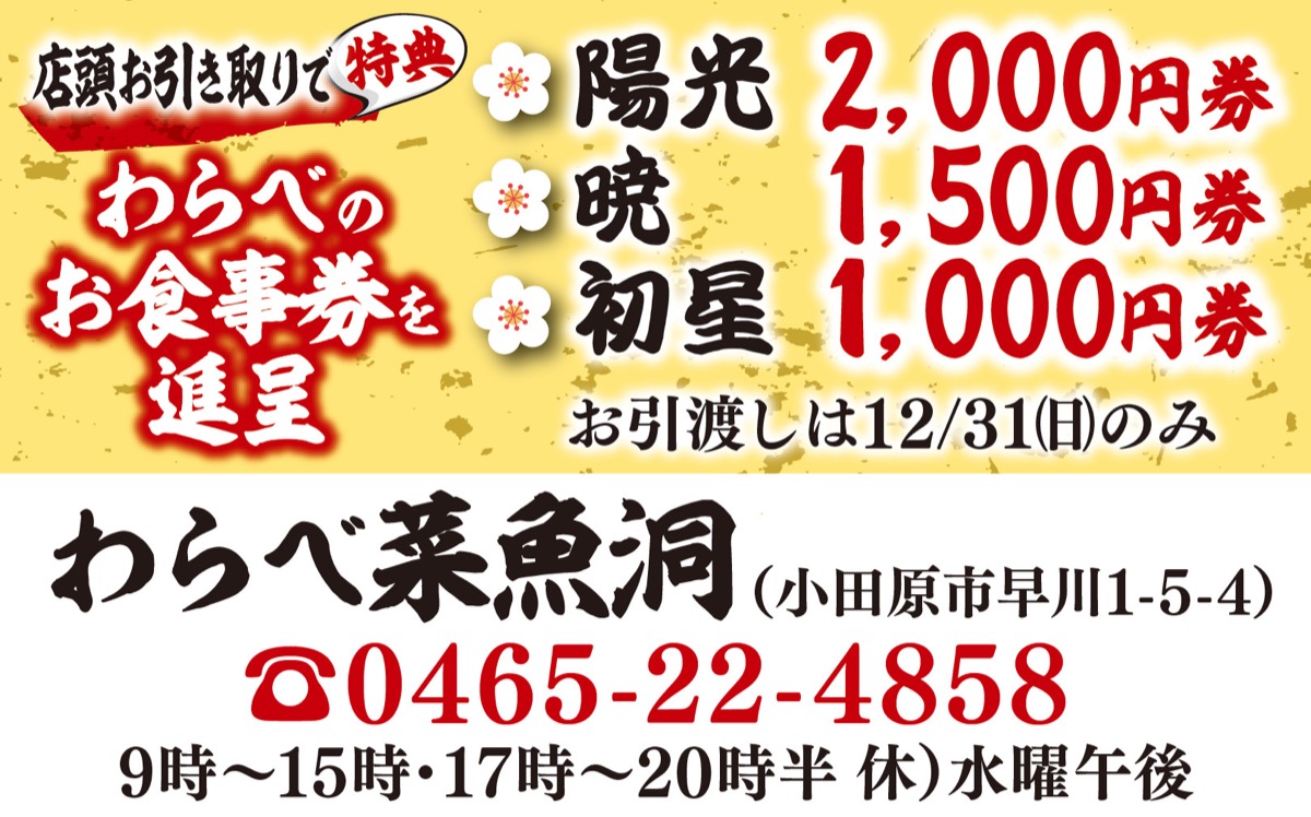 専門店わらべだからこそできる一切妥協のない『本当の手作りおせち』は、希少魚オシツケの西京焼など自慢の魚料理はもとより、豚欧風角煮・洋風栗きんとん・南瓜のつくね羹など、和洋中の多彩な料理がぎっしり手詰めされている。毎年心待ちにする人も多いその味は、年初のひと口にふさわしい。店主は「売り切れる前に早めのご予約を」と自信をのぞかせる。神奈川県内(一部除く)に配達可だが、食事券が進呈される店頭引き取りがお得。実質最大2千円引きだ。電話でパンフレットを即日送付。