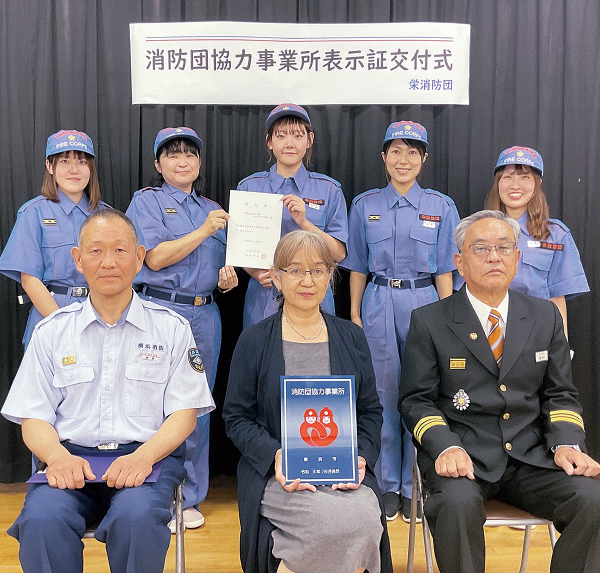 栄区にある学校法人 柳下学園 やまゆり幼稚園(柳下洋一理事長/柳下佳子園長)に勤務する教諭ら6人が今年度から栄消防団に入団した。これを受け、栄消防署と栄消防団はこのほど、同園で消防団協力事業所表示証交付式を実施。団員らは11月3日の栄区民まつりに参加するなど精力的に活動している。幼稚園、保育園での協力事業所は栄区内では初。