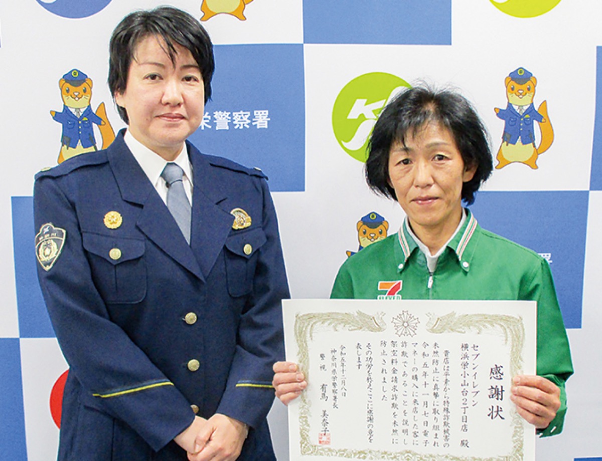 栄警察署(有馬美奈子署長)は12月8日、特殊詐欺被害を未然に防止したとしてセブンイレブン横浜栄小山台2丁目店の店員・川北佳代子さんに感謝状を贈った。