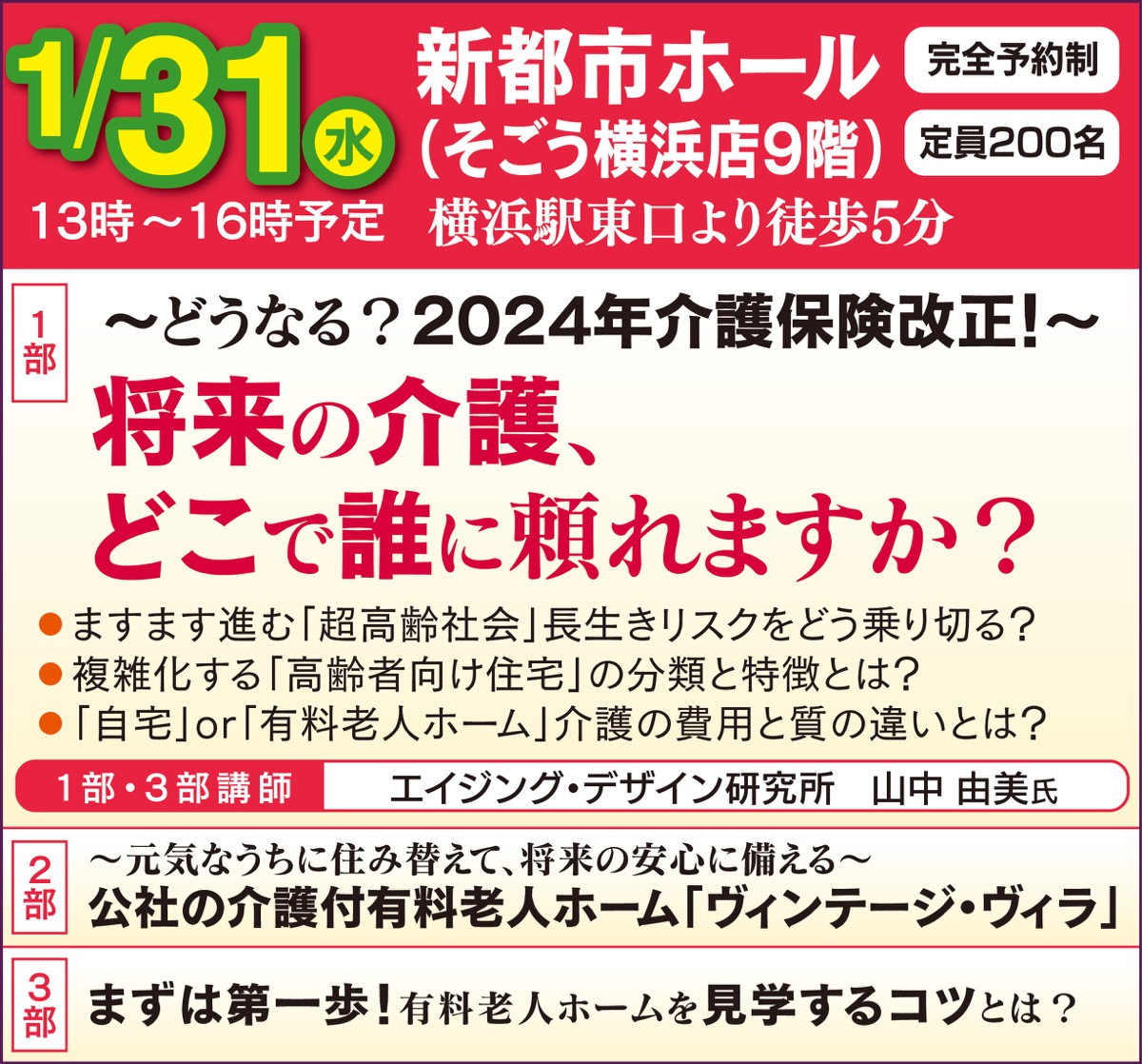 第2部では公社の介護付有料老人ホーム「ヴィンテージ・ヴィラ」の紹介。第3部では実際に有料老人ホームを見学する際のポイントを伝授する。新しい年こそ、真剣に将来の介護や住まいについて考えてみては。