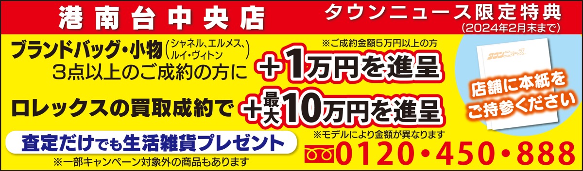 「おたからや港南台中央店」は現在、シャネル、エルメス、ルイ・ヴィトンなどのブランドバッグや、ロレックスなどのブランド時計の買取強化中。