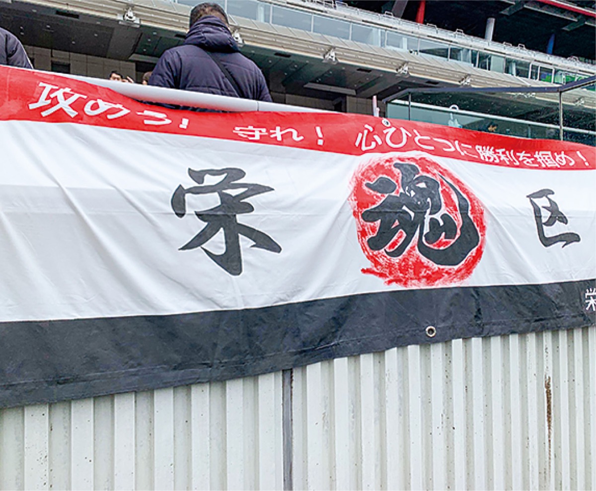 プロサッカー選手がプレーする日産スタジアムで4日、決勝戦が行われた。対戦相手は個人技術の高い泉区選抜。決勝戦では各チーム関係者に声かけを行い、約300人の大応援団がスタジアムに駆け付けた。栄区選抜チームのフラッグに加え各チームの団旗を掲げ、勝利を祈った。