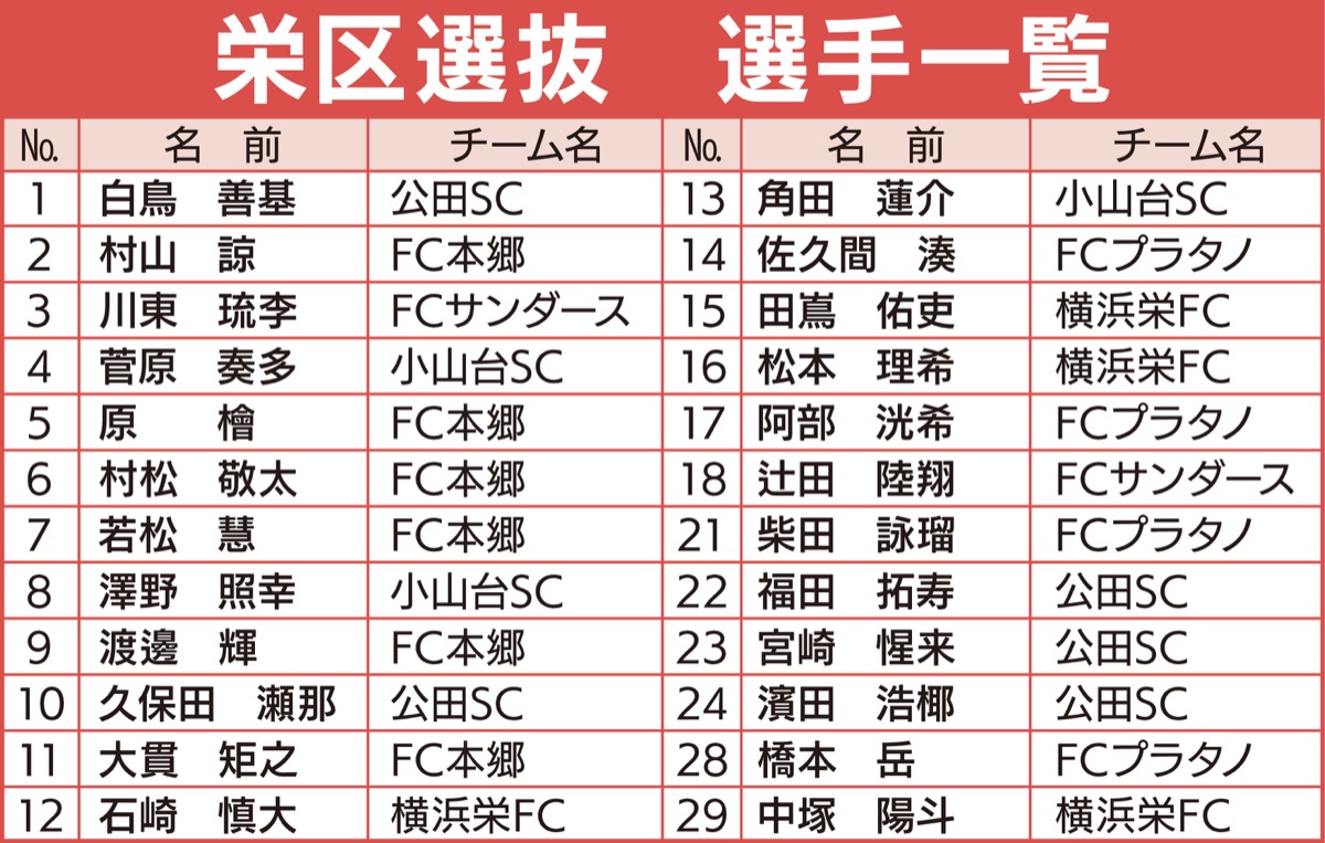 栄区内の小学校等を母体とした公田SCとFC本郷、FCサンダース、小山台SC、FC本郷、横浜栄FC、FCプラタノの7チームから24人の6年生が選抜チームとして招集された。