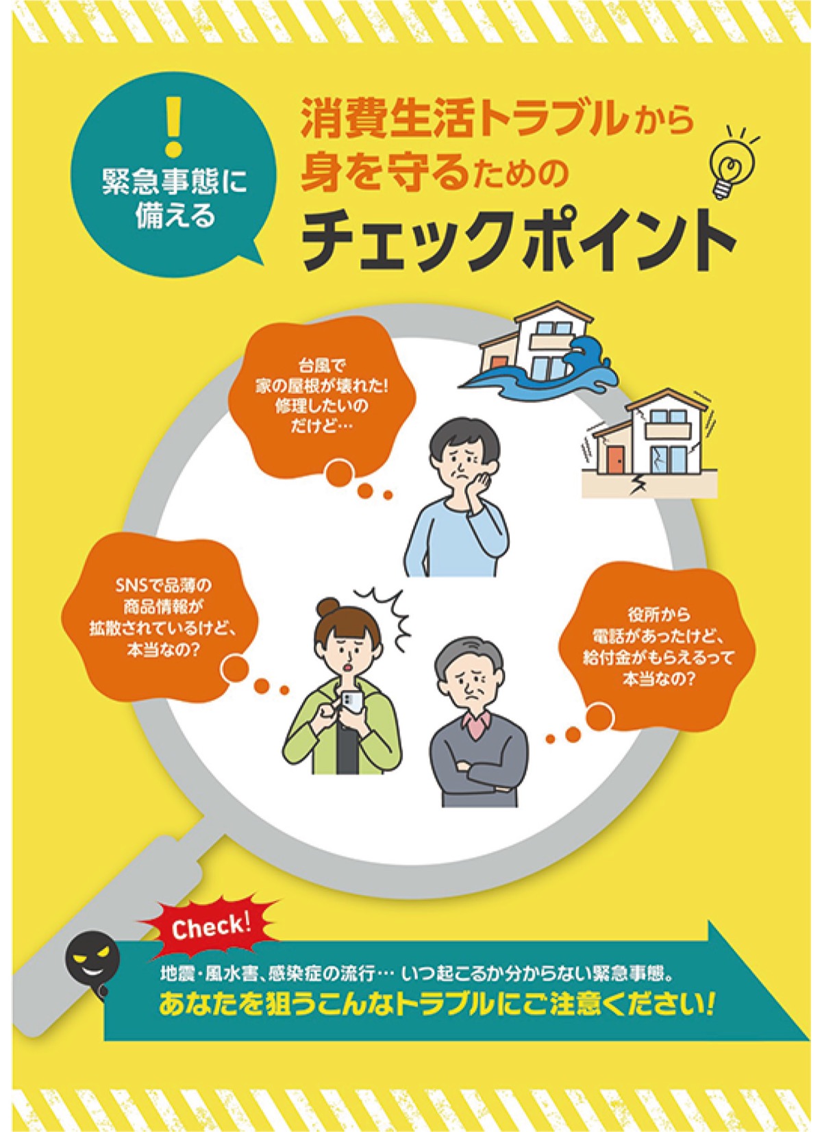 市は、「平時から市民が冷静な行動がとれるように」と、消費生活トラブルから身を守るためのチェックポイントをまとめた啓発冊子を作成。「災害で壊れた屋根の工事をしないかと点検に来た業者に勧誘されて契約したが、高額なので解約したい」などの相談事例と注意点などが紹介されている。冊子は各区役所などで3月以降に順次配架される。