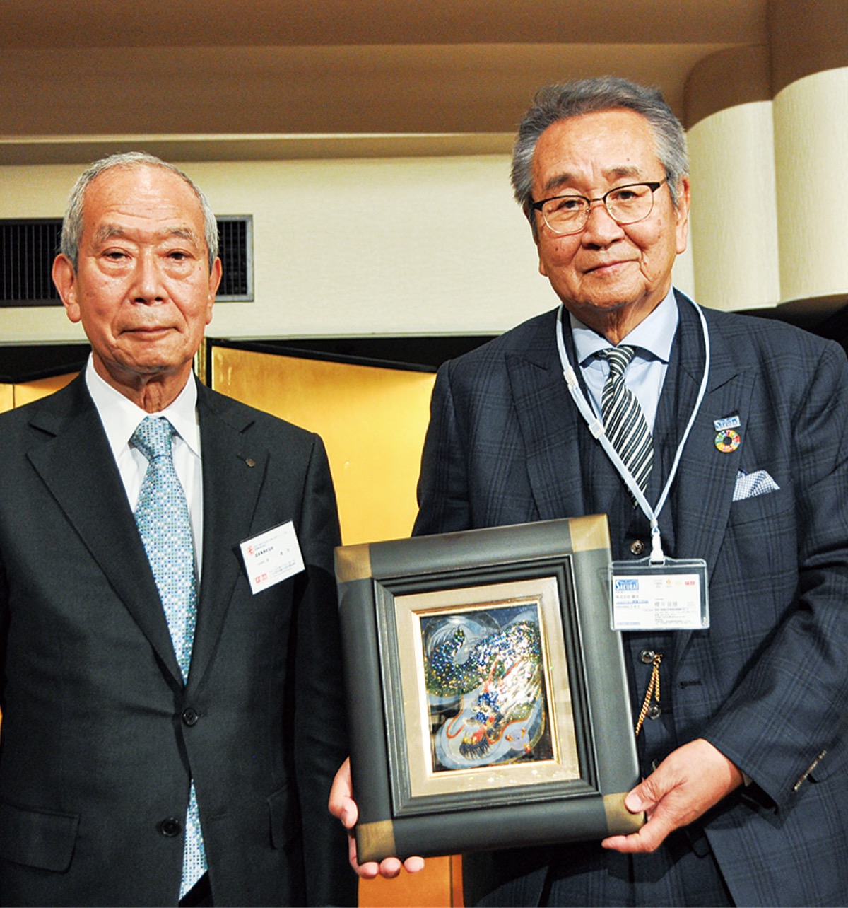 会の中で、森商事(株)代表取締役で櫻友会の森庸男会長は「七宝焼」の龍がデザインされた記念品を櫻井社長に贈呈し、「今年は辰年なので、200年に向かって昇っていって欲しいとの思いをこめた」と説明した。