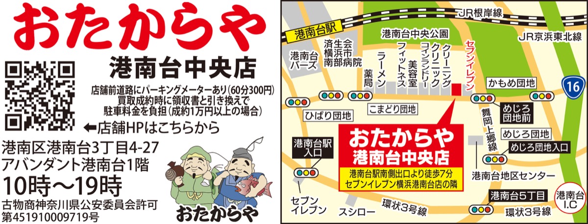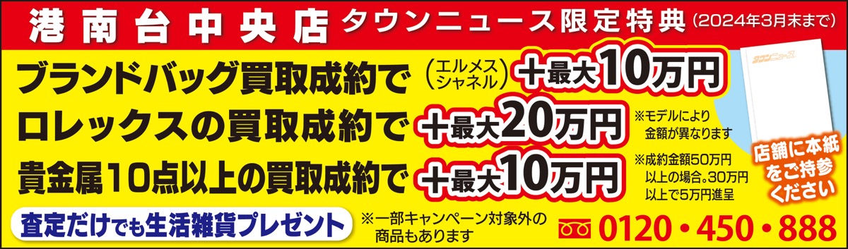 「おたからや港南台中央店」は、戸塚にある姉妹店の開店1周年記念に合わせ、買取金額アップキャンペーンを実施している。
