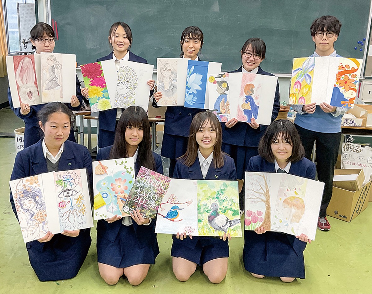 生徒たちは花をテーマに想像を膨らませ原画を作成。菊やチューリップなどを作品の中に取り入れた。また、フラッグに印刷した際に目立つような配色を意識しながら原画を描いたという。