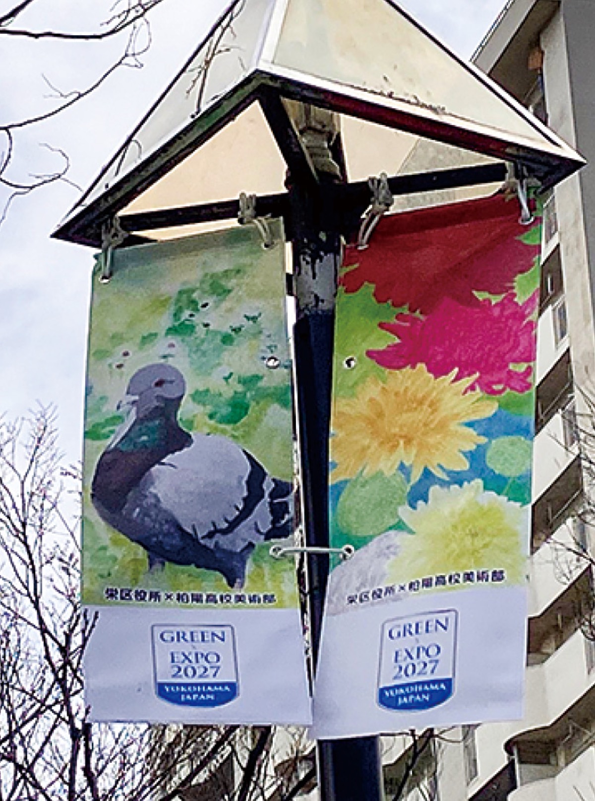栄区の柏陽高校美術部が原画を手掛けたフラッグが3月26日から、本郷台駅前の街灯に設置されている。同校美術部と栄区役所による取り組みで「ガーデンネックレス横浜2024春」、「GREEN×EXPO2027」のPRが目的だ。