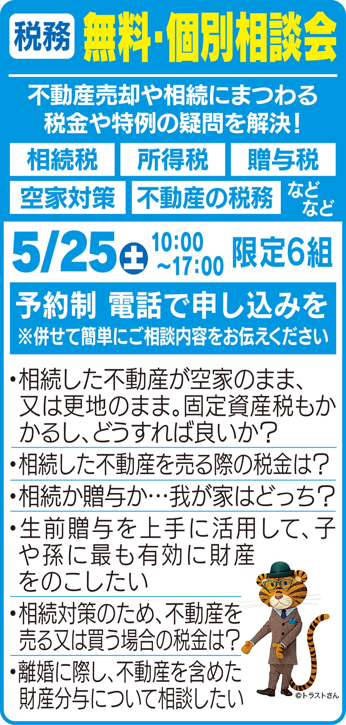 相続税や贈与税、有効活用、購入・売却・住み替えなど不動産に関するお悩みや疑問について、相続や不動産を専門とする同社の提携税理士に相談できる貴重な機会だ。「我が家に相続税はかかるの?」「相続した不動産はどうすればいい?」「節税案を知りたい」など1組60分、我が家の場合での相談が可能。限定6組予約制(先着順)。申込みは左記【フリーダイヤル】で。