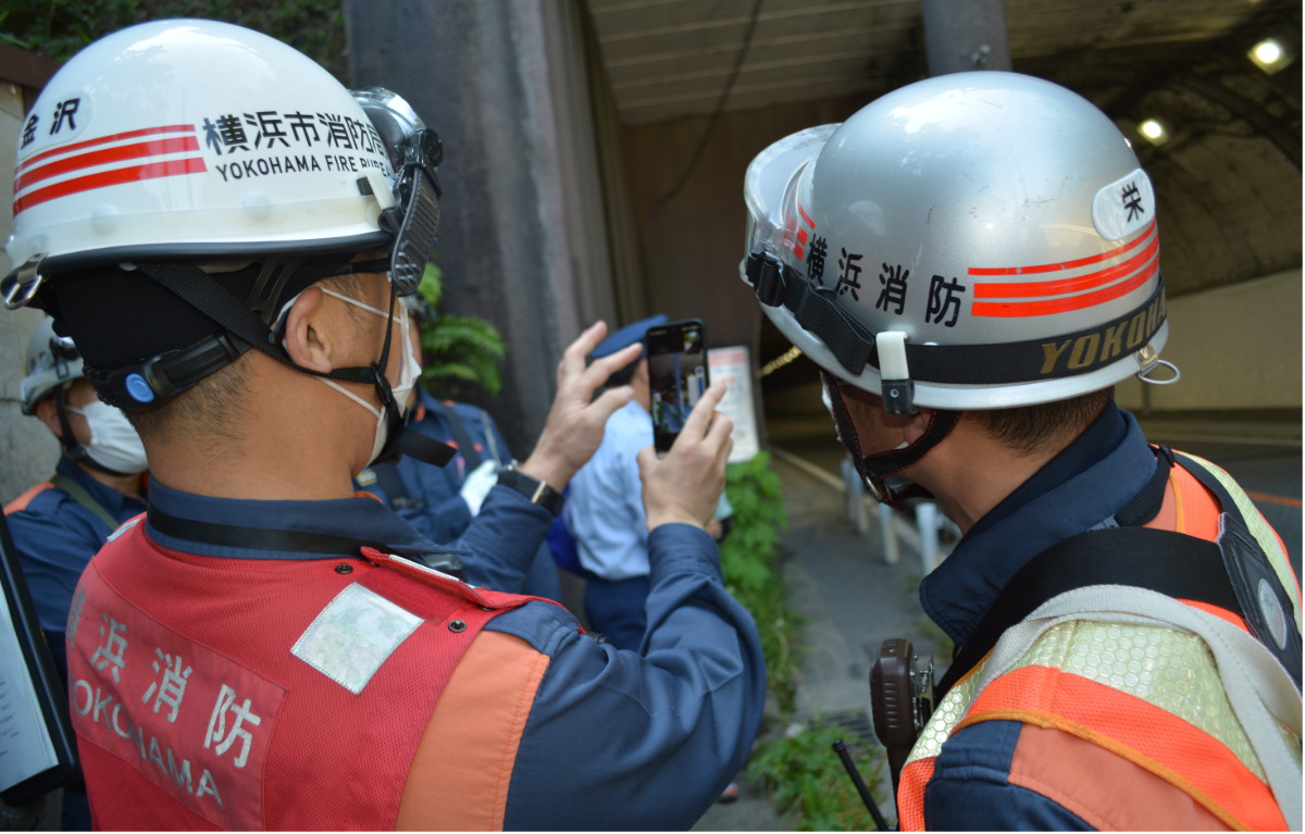当日は参加した各署所属の隊員たちがトンネル内を歩き、非常通報装置8カ所、非常電話4カ所の状態を確認。さらに、離れた場所で映像によるweb会議が行えるサービス「Zoom」を用いた通信試験を両開口部で行った。横浜市消防局は消火現場での通信手段として2021年10月からZoomを導入しているが、相武隧道で試験が行われるのは初めて。互いのスマホを通じ映像を共有することで煙の出方などを視覚的に把握し、どちら側から放水するかなどの判断に役立てるという。また、この映像は保土ケ谷区の司令センターにも同時に送られ、遠隔地でも状況を確認することが可能になる。