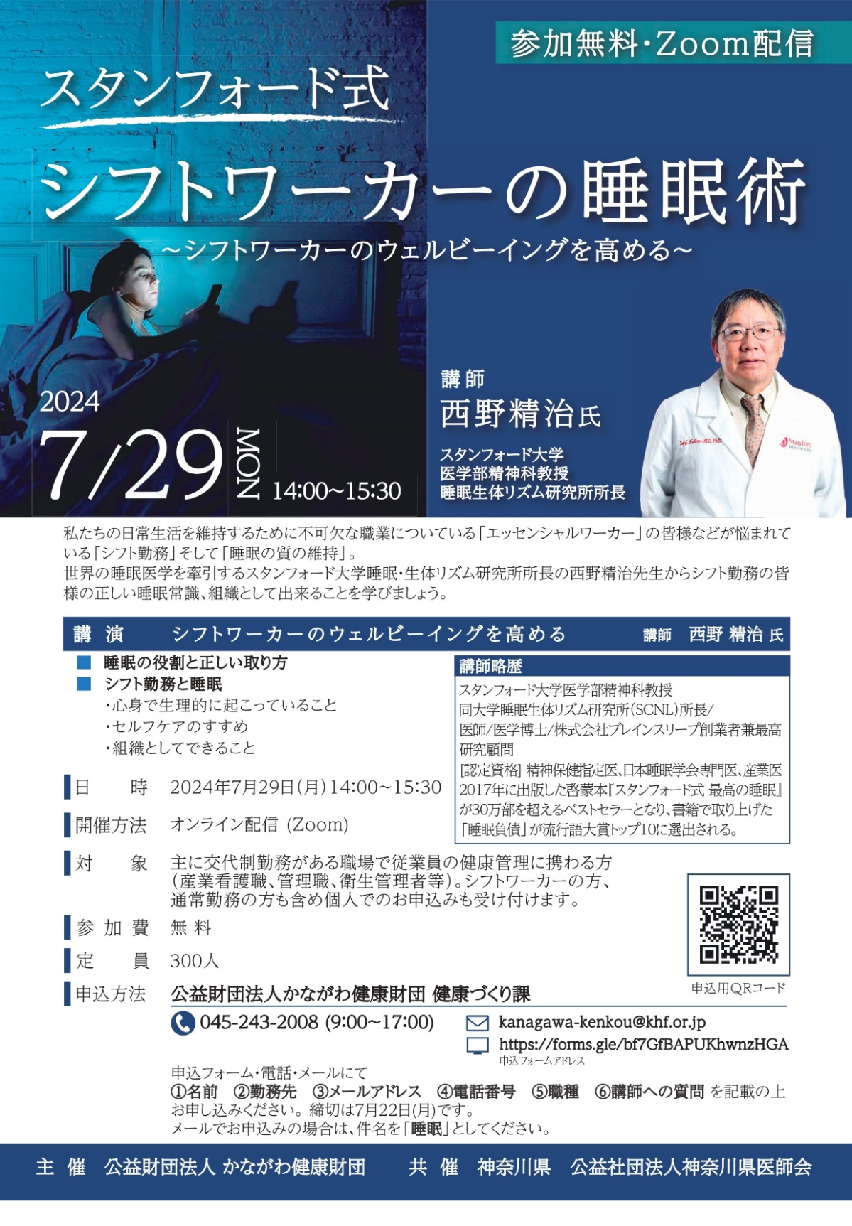 (公財)かながわ健康財団主催の企画「スタンフォード式 シフトワーカーの睡眠術 〜シフトワーカーのウェルビーイングを高める〜」が7月29日(月)午後2時からオンラインで配信される(※Zoom使用)。時間は午後3時半まで。