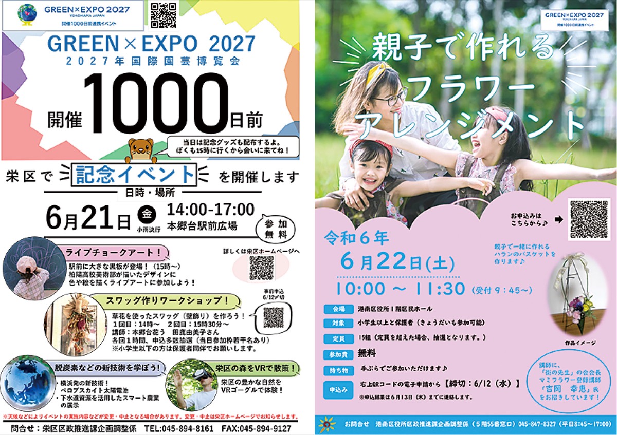 2027年3月19日から旧上瀬谷通信施設で開催される「GREEN×EXPO2027(2027年国際園芸博覧会)」まで、6月22日で1000日前となるのに合わせ、市内各区はPRを目的としたイベントを開催する。栄区は21日(金)、港南区は22日(土)の予定だ。