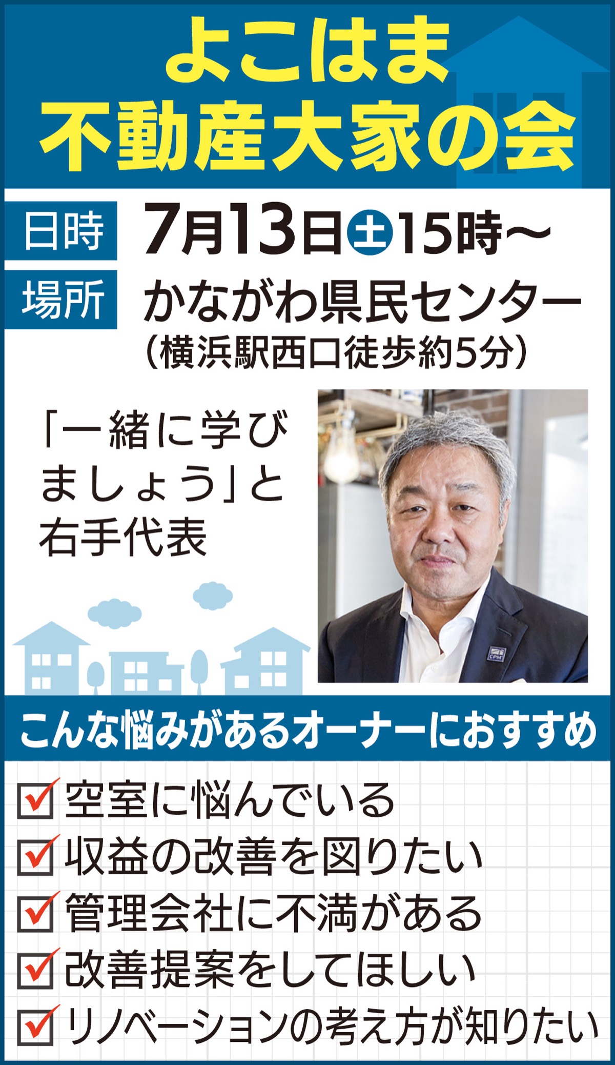 横浜市内の不動産大家による大家のための「よこはま不動産大家の会」が、このほど発足。7月13日(土)午後3時から、かながわ県民センター(横浜駅西口徒歩約5分)で勉強会を開く。