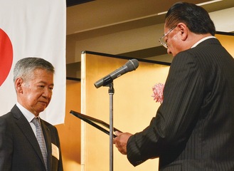 総会後に開かれた懇親会では、同会が地域貢献として行った4区の青少年育成事業への寄附に対し、各区から感謝状が贈られた。4区を代表して港南区の栗原敏也区長が、木田会長に感謝状を手渡した。