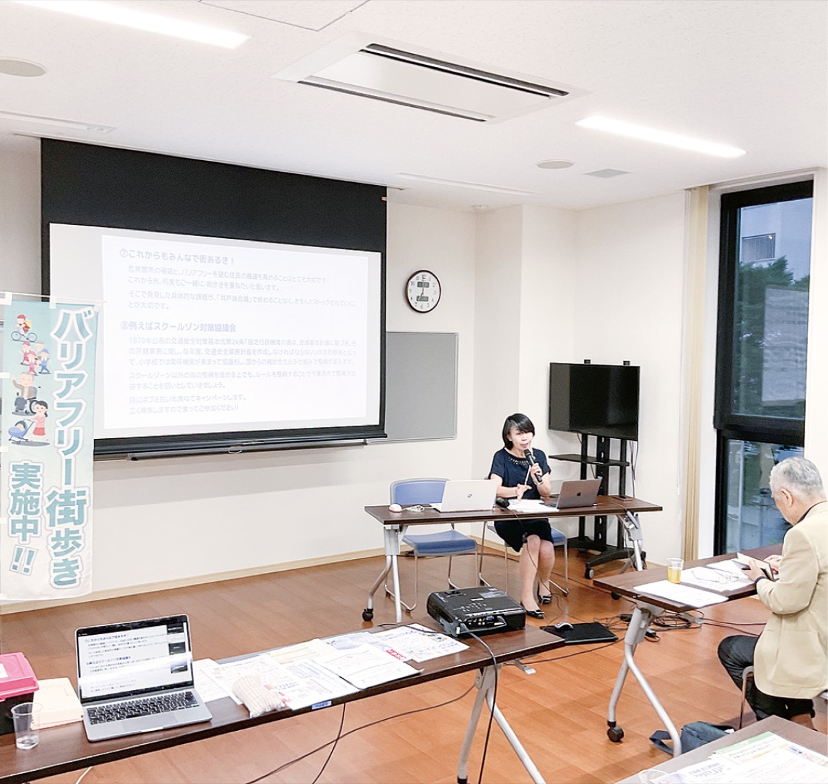 当日は日本開発構想研究所の小畑晴治さんらが講師を務め、街づくりとバリアフリーについて諸外国の事例を参考に参加者へ伝えた。