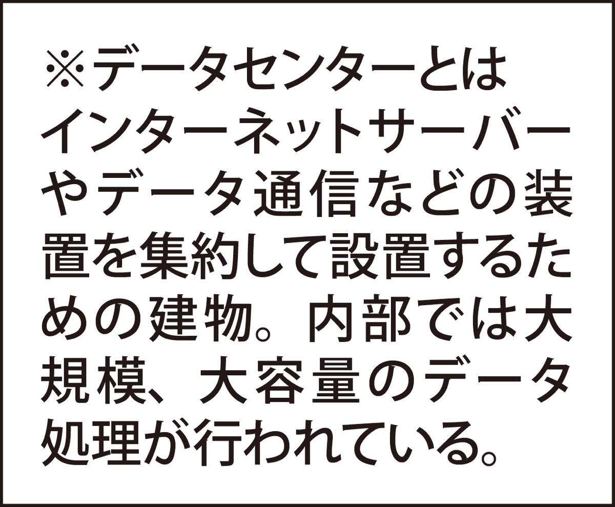 インターネットサーバーやデータ通信などの装置を集約して設置するための建物。内部では大規模、大容量のデータ処理が行われている。
