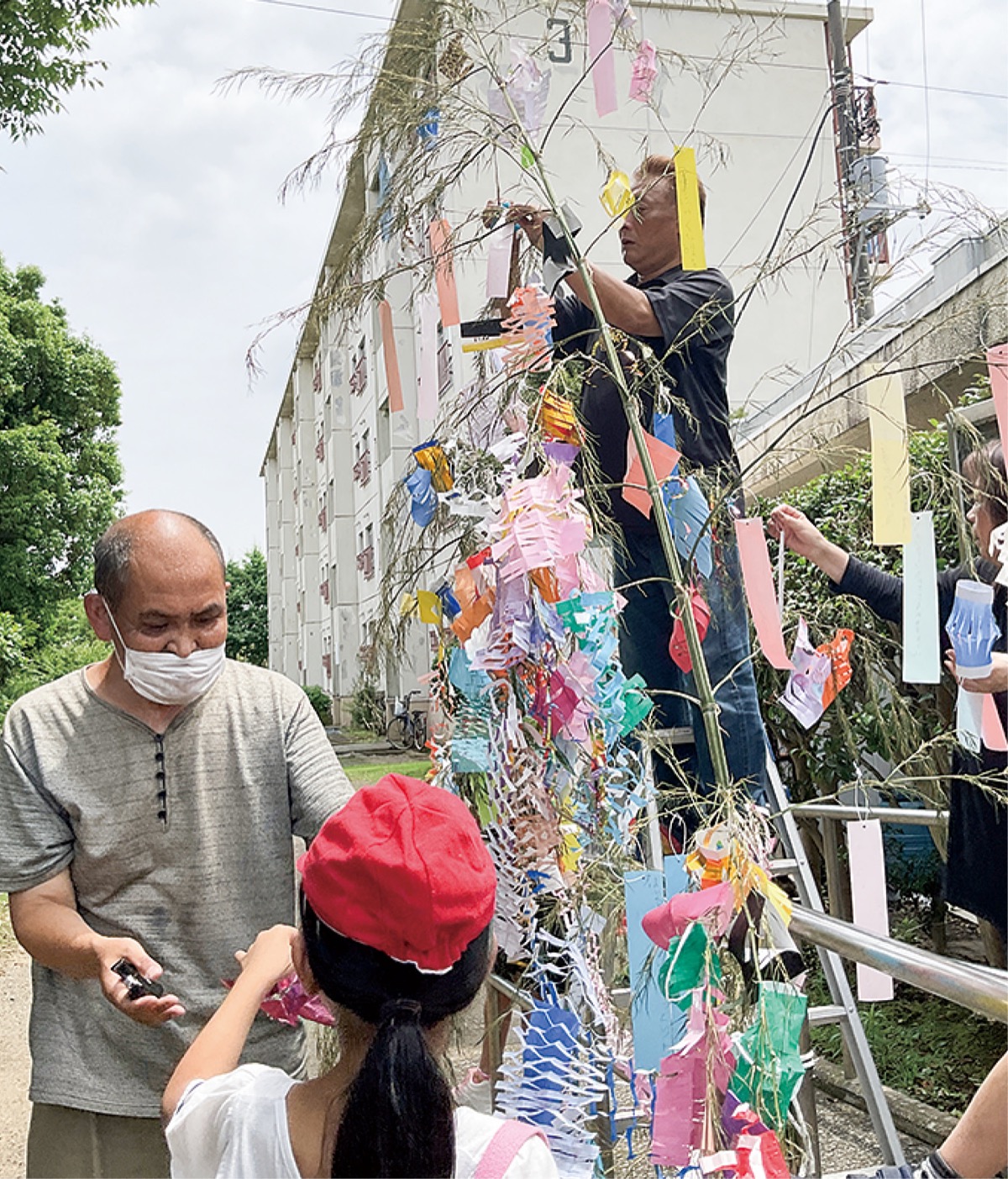 7月2日、野庭住宅第一自治会と野庭すずかけ小学校、同住宅第二自治会と下野庭小学校が協力し、地域住民、児童が協力して七夕飾りを一緒に作成した。第一自治会を訪れたすずかけ小児童は約60人。「かぞくがへいわにくらせますように」など、児童の願いを込めた短冊を笹に装飾した。「児童と住民が交流できてよかった」と第一自治会の黒川和紀会長は企画を振り返った。