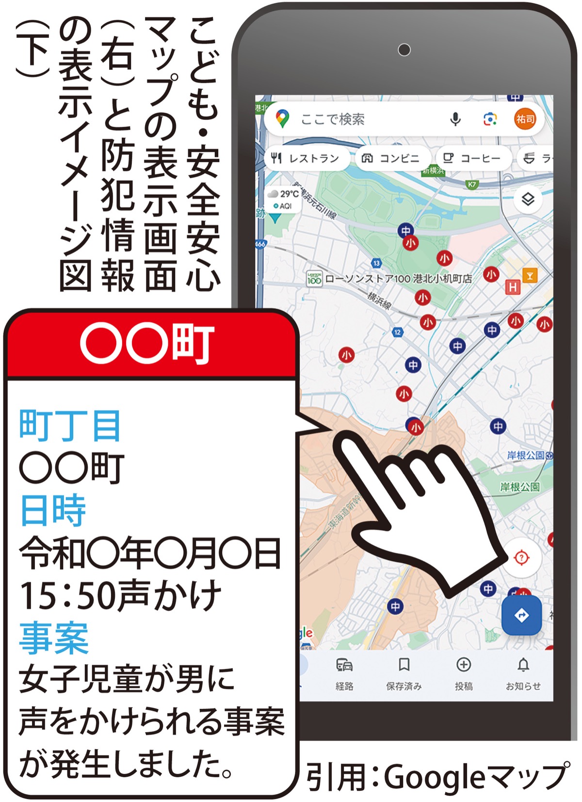 横浜市は7月10日、Googleマップで市内小中学生の交通事故の発生場所や事故概要のほか、声かけ・不審者の防犯情報を見える化した「こども・安全安心マップ」をリリースした。
