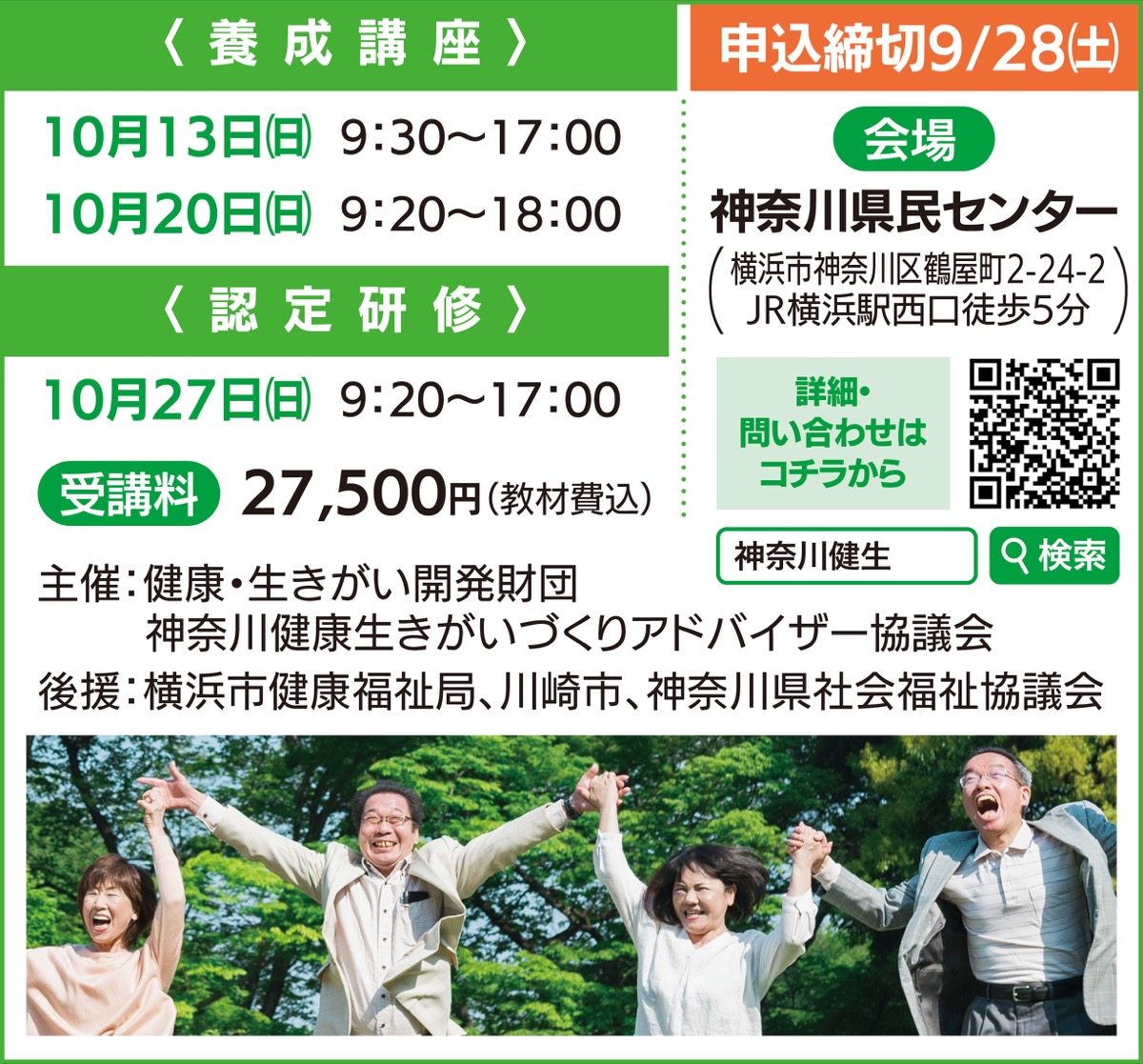 (一財)健康生きがい開発財団が認定する民間資格「健康生きがいづくりアドバイザー」養成講座・認定試験が10月に横浜で開講される。
