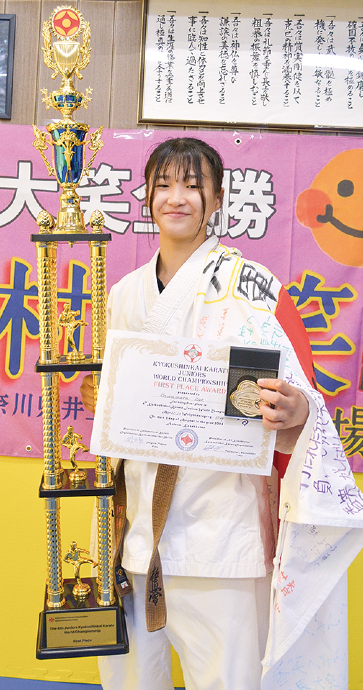上郷中学校2年の川村香笑さんが8月2日、カザフスタンで行われた極真空手の世界大会「第4回世界ジュニア大会(12歳から13歳・50kg未満・女子の部)」に出場。海外選手を相手に勝ち抜き優勝を果たした。