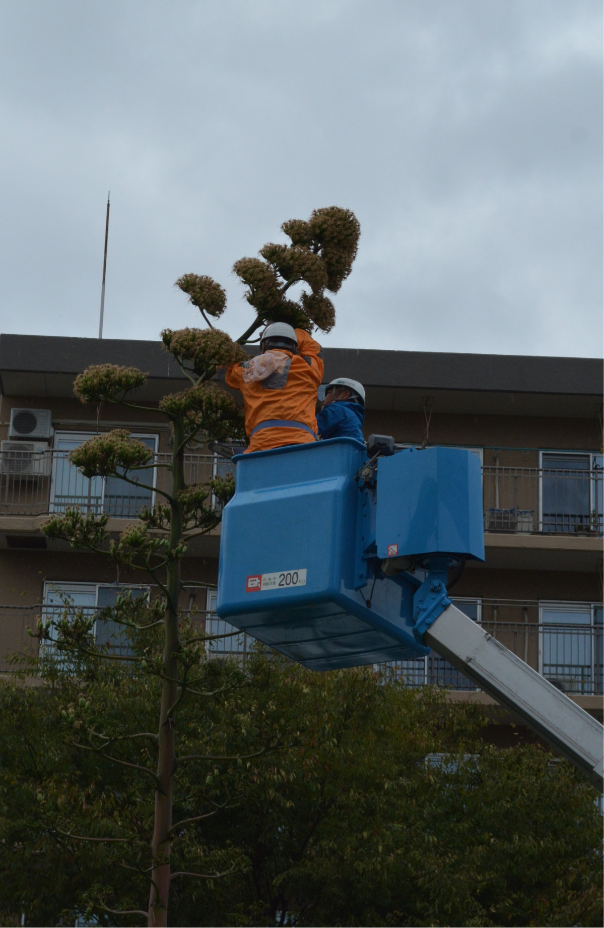 しかし、台風10号の進路と花茎の傾き方などを見極め、28日に伐採を決定。花茎が倒れ、交通の妨げになることを懸念しての判断となった。
