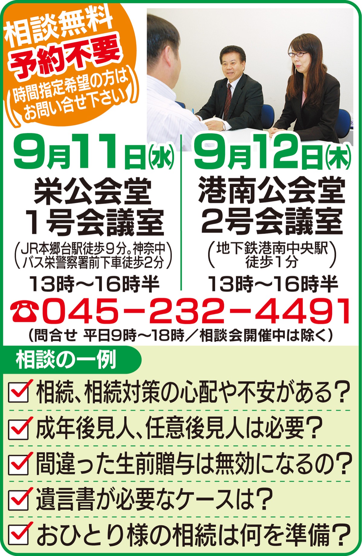 行政書士や社団法人代表など相続の専門家による遺言書、後見人、相続対策、贈与、不動産など相続全般に関わる無料個別相談会が開催される。横浜市民 相続 遺言 贈与相談センターの主催。