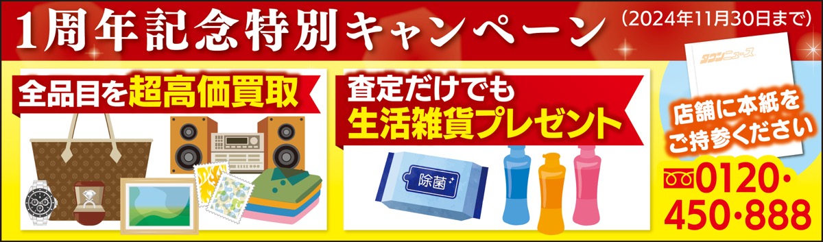 まもなく開店1周年を迎える「おたからや港南台中央店」。記念として11月30日(土)まで、「超高価買取キャンペーン」を実施する。