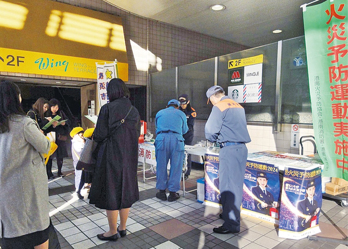 港南署は11月12日、京急上大岡駅付近で消防署員と消防団員が参加。啓発ティッシュやチラシなどを配った。