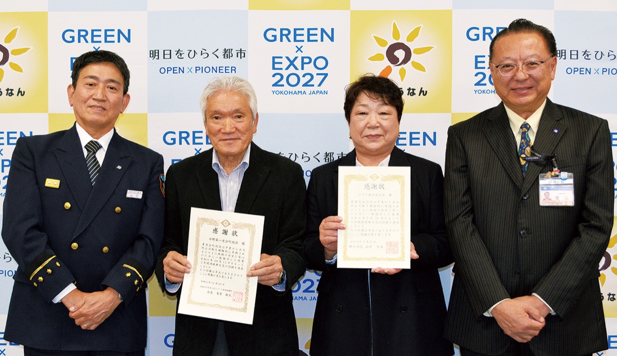 ひぎり連合自治会(宮島由美子会長=中央右)は11月20日、4年間の無火災を達成したとして市長表彰を受けた。同会は9月26日に基準達成となった。また、2年間の記録で日野第一連合町内会(小後摩和雄会長=中央左)も「港南区安全安心まちづくり推進協議会会長表彰」を受けた。