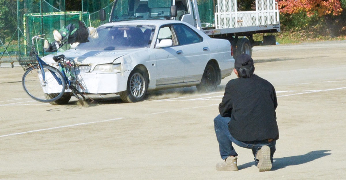 同教室は、「危険を直視する」という意味の「スケアード・ストレート」=写真=の形で実施。当日は(有)シャドウ・スタントプロダクションのスタントマンによる事故現場の再現がされ、交通事故の危険性を伝えた。生徒による乗車体験で急ブレーキをかける車に乗った生徒は「身構えていてもすごい衝撃だった」と話した。