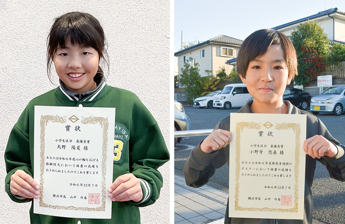 障害者週間(12月3日から9日)の取組として、内閣府は心の輪を広げる障害者理解促進事業を都道府県・指定都市と共催し「心の輪を広げる体験作文」と「障害者週間のポスター」を募集し、優れた作品を表彰している。このほど、同事業の横浜市最優秀賞が決定し、小学生区分の作文は大野陽夏さん(永野小6年)、ポスターは小野寺悠眞さん(港南台第三小4年)と、港南区の児童2人だった。