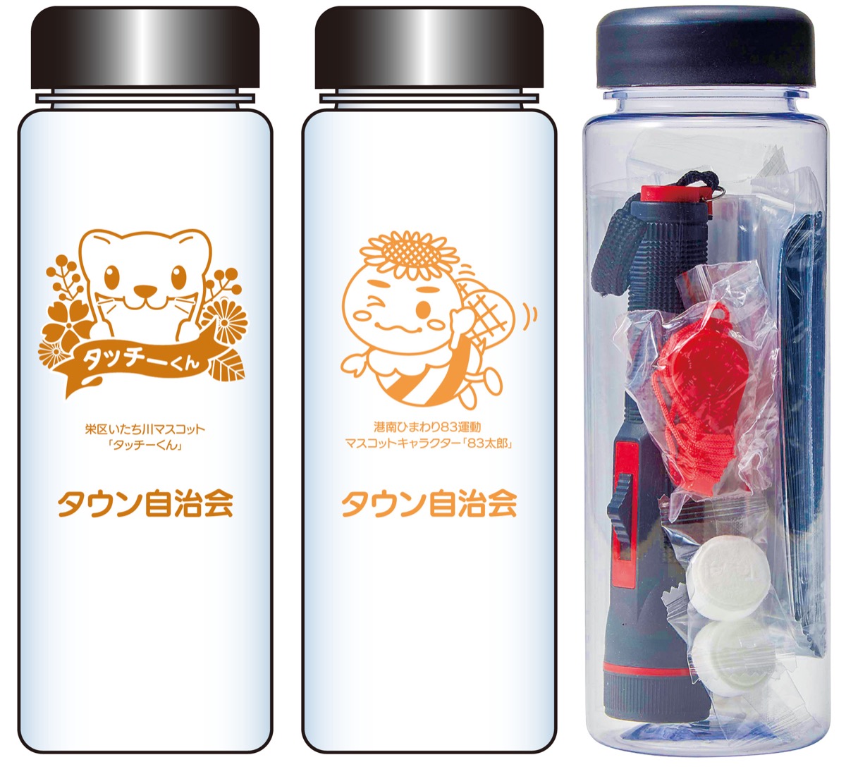 タウンニュース社では災害への備えとして、防災ボトルの普及を提案しているが、このほど新たに港南83運動マスコットキャラクター「83太郎」と栄区マスコットキャラクター「タッチーくん」に、団体名が印刷できるオリジナル防災ボトルの提供を始めた。