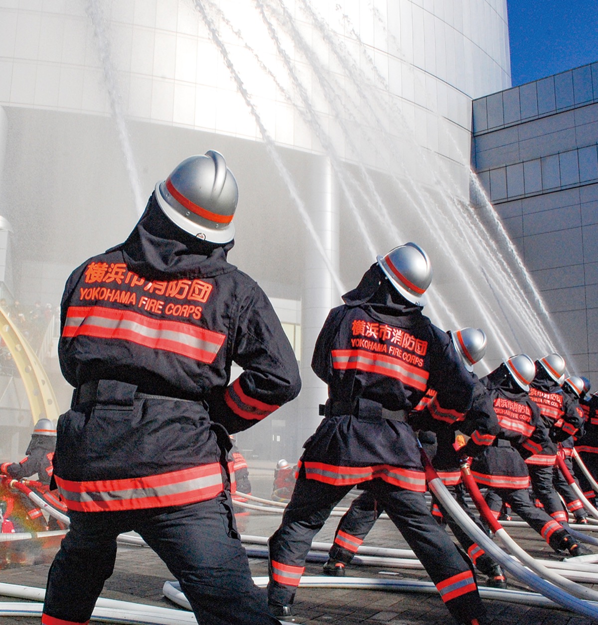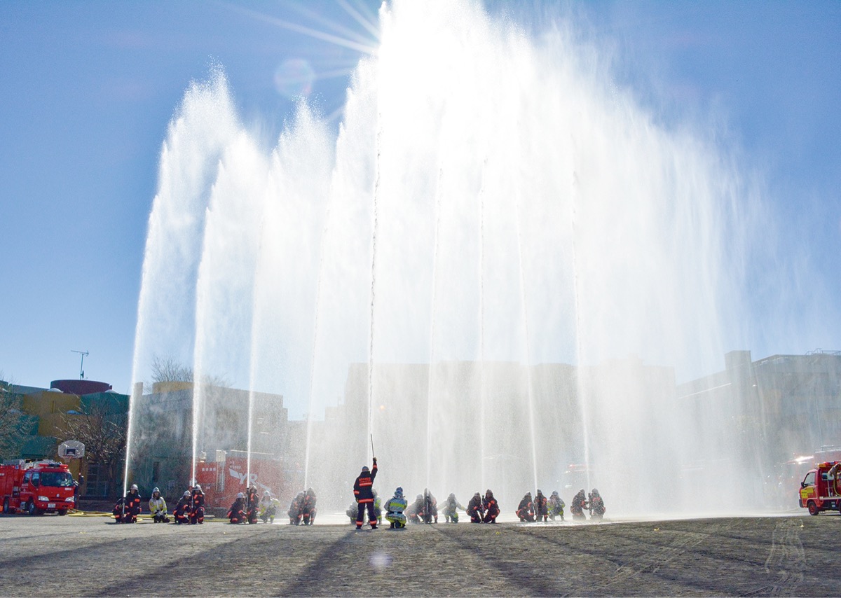 その後、会場を港南ふれあい公園に移した第二部では消防団員らによる一斉放水が行われた。上空高くまで勢いよく上がる水柱に対し、集まった子どもたちからは歓声。カメラを構える大人の姿も多く見られた。また、消防車両などが隊列を組んで紹介された。