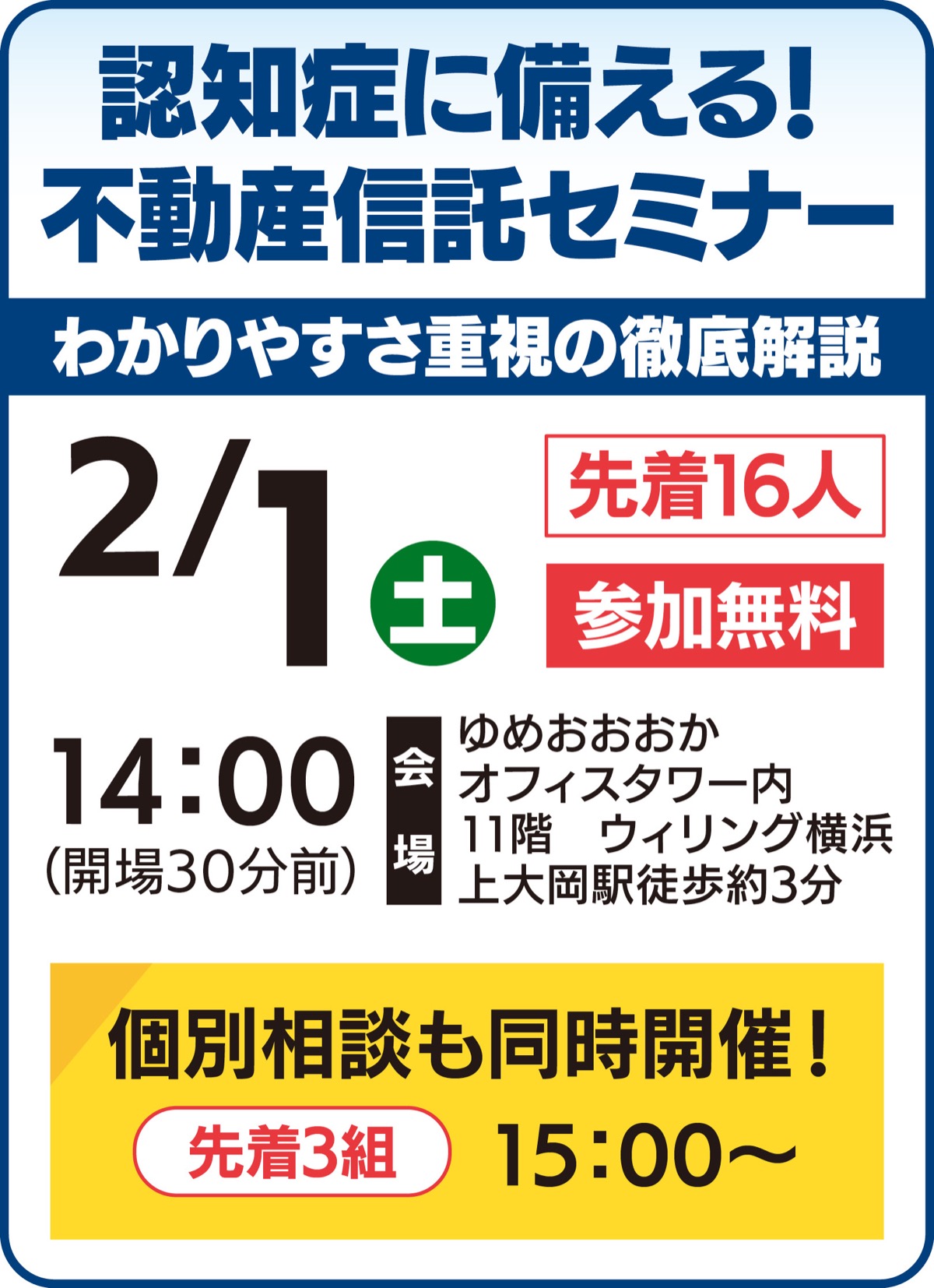 悩める人のために同社は2月1日(土)、「認知症に備える 不動産信託セミナー」を無料で開催する。先着16人。個別相談も開催(3組まで)。