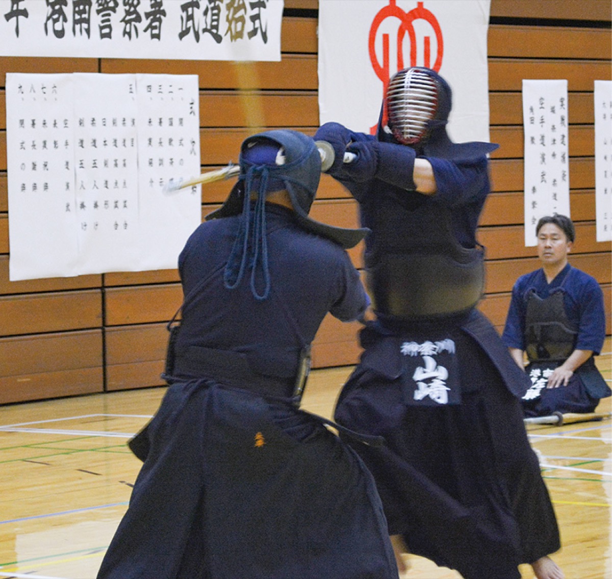 その後、署員同士による柔道、剣道の高点試合や署員が県警特別訓練員に胸を借りる五人掛けが行われた。また、5年前から空手を習っているという角田徹交通課長による空手道演武では板割り、瓦割りが披露され会場は盛り上がりを見せた。