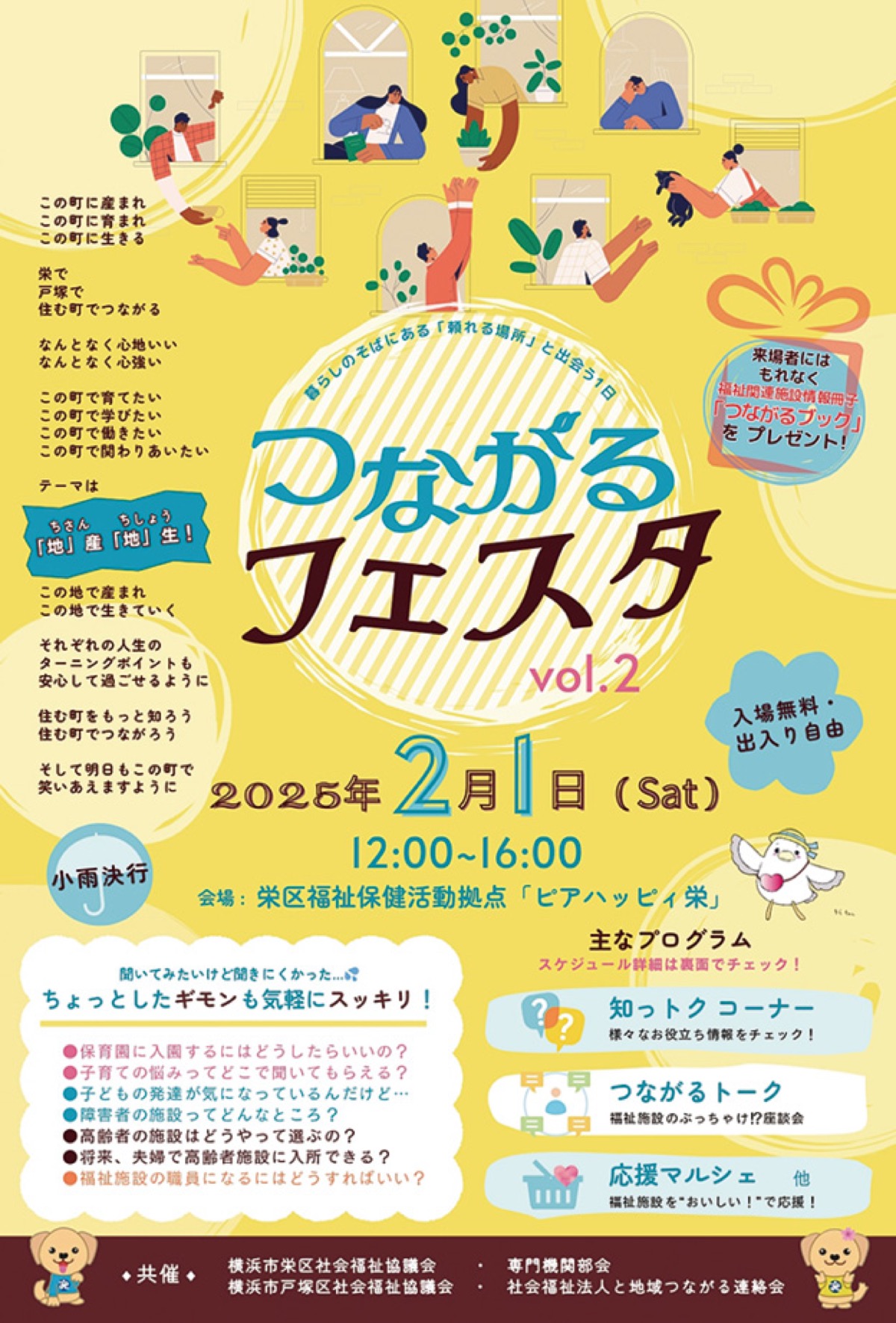 栄、戸塚の福祉関係者が集う「つながるフェスタ」が2月1日(土)正午〜午後4時、栄区福祉保健活動拠点ピアハッピィ栄(桂町279の29)で開催される。主催は社会福祉法人地域つながる連絡会(戸塚区社会福祉協議会)、専門機関部会(栄区社会福祉協議会)。