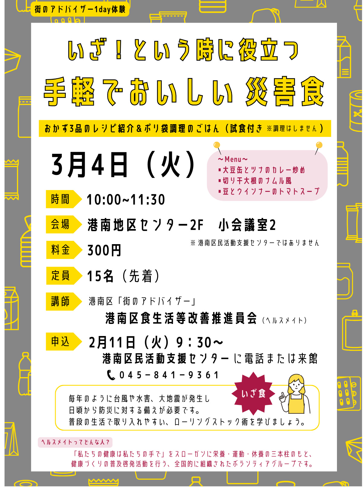 当日は港南区福祉保健課の指導を受けたボランティアグループ「港南区食生活等改善推進員会(ヘルスメイト)」のメンバーが災害時でも作ることができる「大豆缶とツナのカレー炒め」「切り干大根のナムル風」「豆とウインナーのトマトスープ」のレシピを紹介する。今回が初の開催となる。