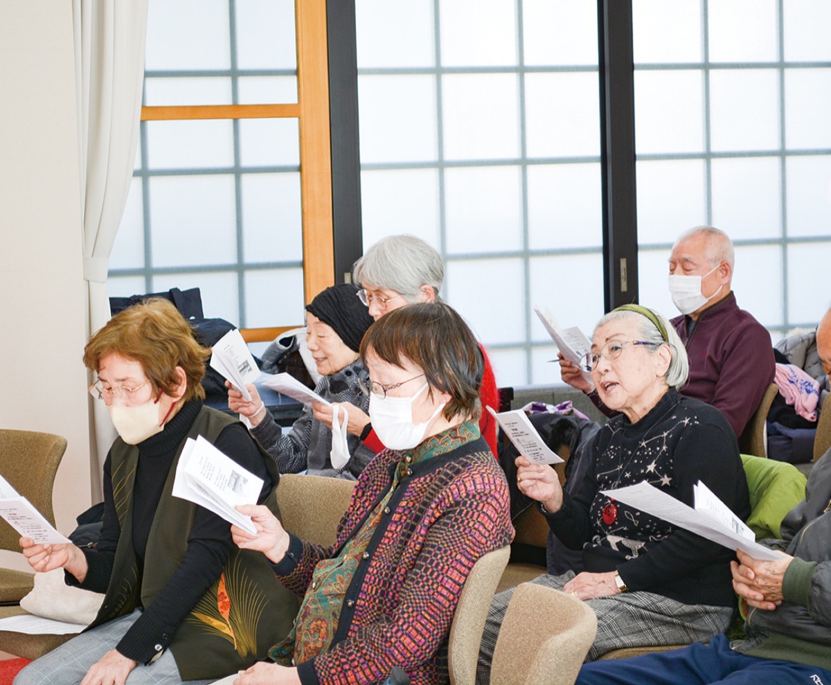 上大岡第一町内会は1月31日、西福寺観音堂(上大岡東1の38の19)で「うたの会」を開催した。これは、大きな声で童謡を歌うことで、口周囲の筋肉を鍛え、誤嚥防止につなげようというもの。町内会を中心に集まった高齢者など約20人が参加。最初に入念なストレッチを行った後、講師の保秀樹さんが「だみ声でも、上手でなくても構いません。とにかく声を出しましょう」と指導し、「たき火」「豆まき」「サッちゃん」などの童謡を歌った。