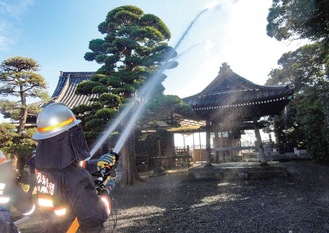 また、玉泉寺では訓練用文化財の搬出、119番通報、避難誘導、初期消火を実施。さらに、放水では署員、団員に寺院関係者も加わった。