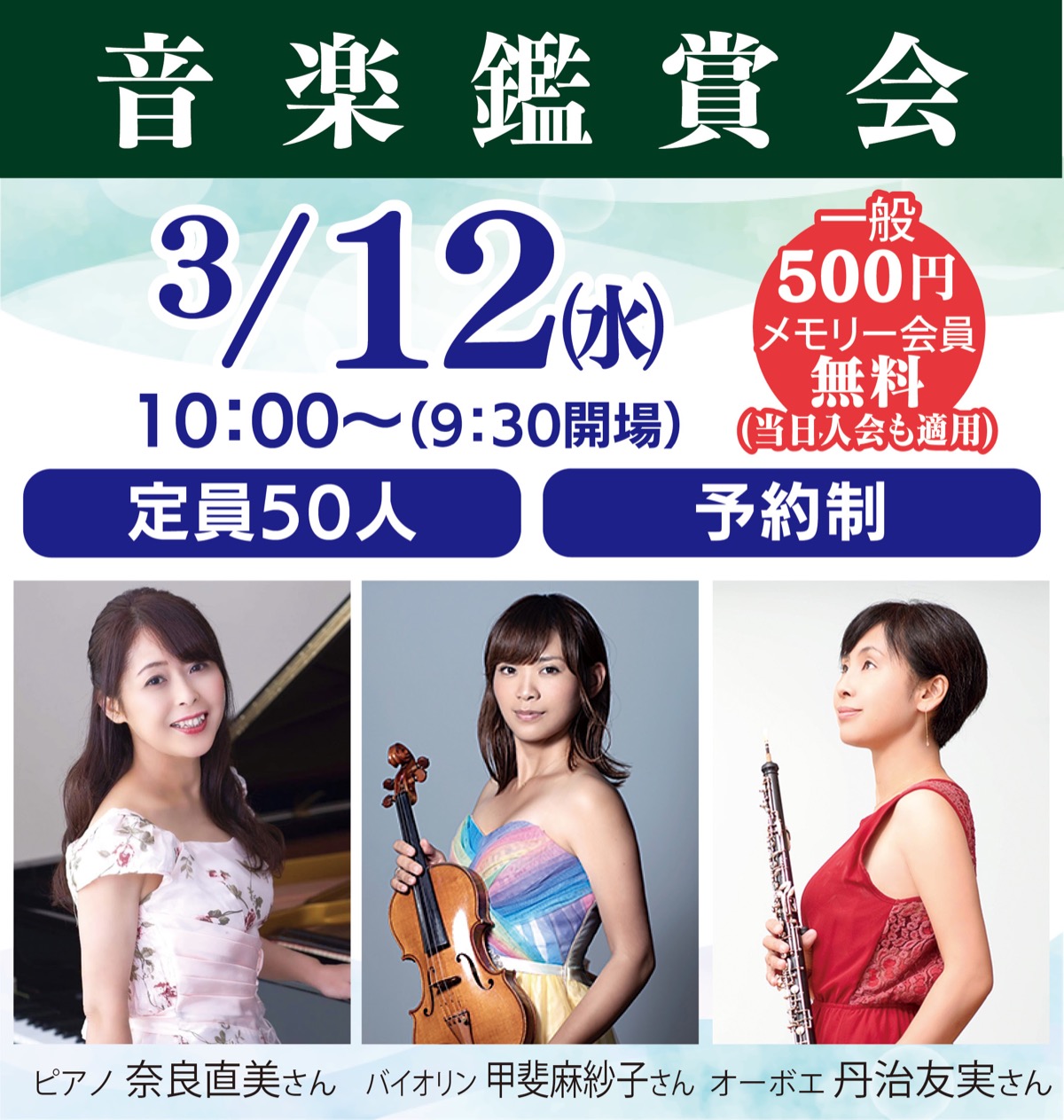 入会金は2千円(税込)、年会費・更新料なし。今回の音楽鑑賞会では、当日入会の人も割引対象となるため、この機会に入会してみては。