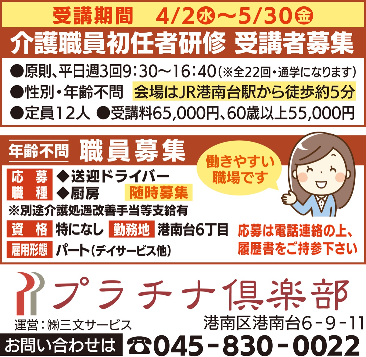 1カ月半の短期間に就職、進学に役立つ「介護職員初任者研修」で資格取得を。「良質な介護サービスを提供するためには人材こそ全て」と話すのは、港南台を中心に介護保険指定事業所として「プラチナ倶楽部」ブランドの施設を運営する株式会社三文サービスの河野文彰社長だ。