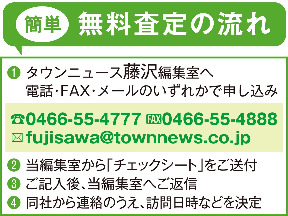 不動産の無料査定を希望する人は、企画窓口のタウンニュース藤沢編集室へ連絡。後日送付される「チェックシート」を記入し、返信するだけ。締め切りは3月31日(月)。