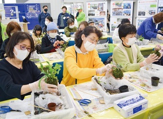 講師は港南区公園愛護会連絡協議会(森貴会長)のメンバーが務め、参加者は土の扱いに苦戦しながらもコケ玉作りを楽しんだ。同日に3回行われた同講座だが全ての回で定員に達し、キャンセル待ちの応募者も発生。その他にも、日野中央高等特別支援学校の生徒が作成したコケ玉やハーバリウムの展示、園芸博関連のグッズ配布などが行われ、多くの人が訪れた。