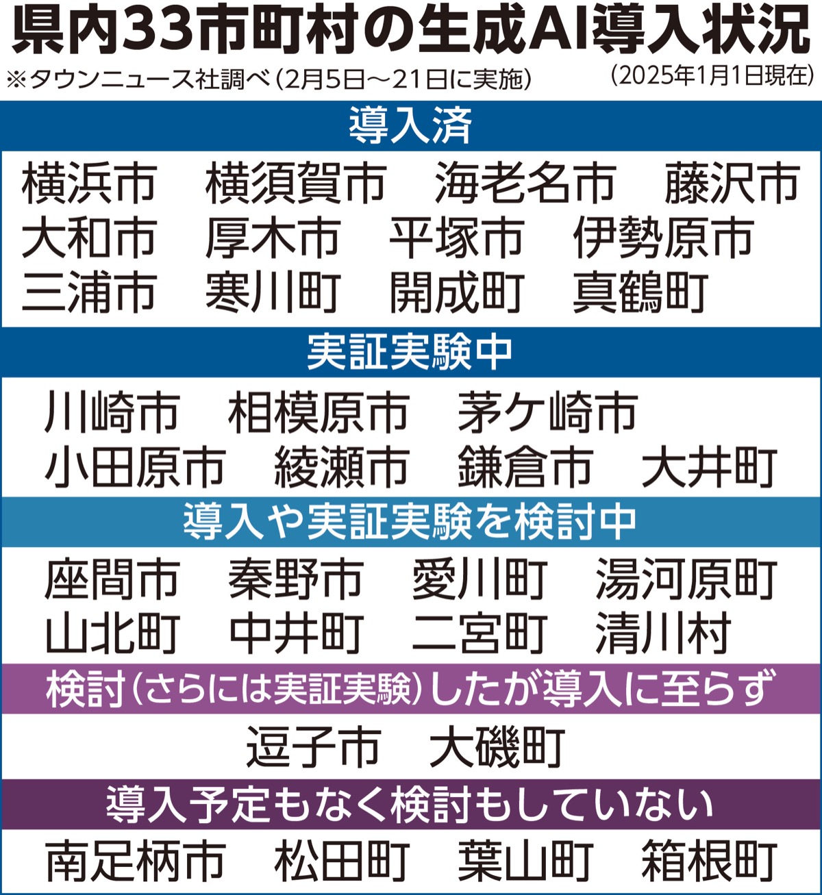 人工知能(AI)を用いて文章や画像を作成する生成AIが世界的に普及する中、業務に導入する自治体も増えてきている。神奈川県内33市町村のうち、導入済が12市町村で実証実験中を合わせ6割近い19市町村が生成AIを利用していることが、タウンニュース社の独自アンケート調査で明らかになった。