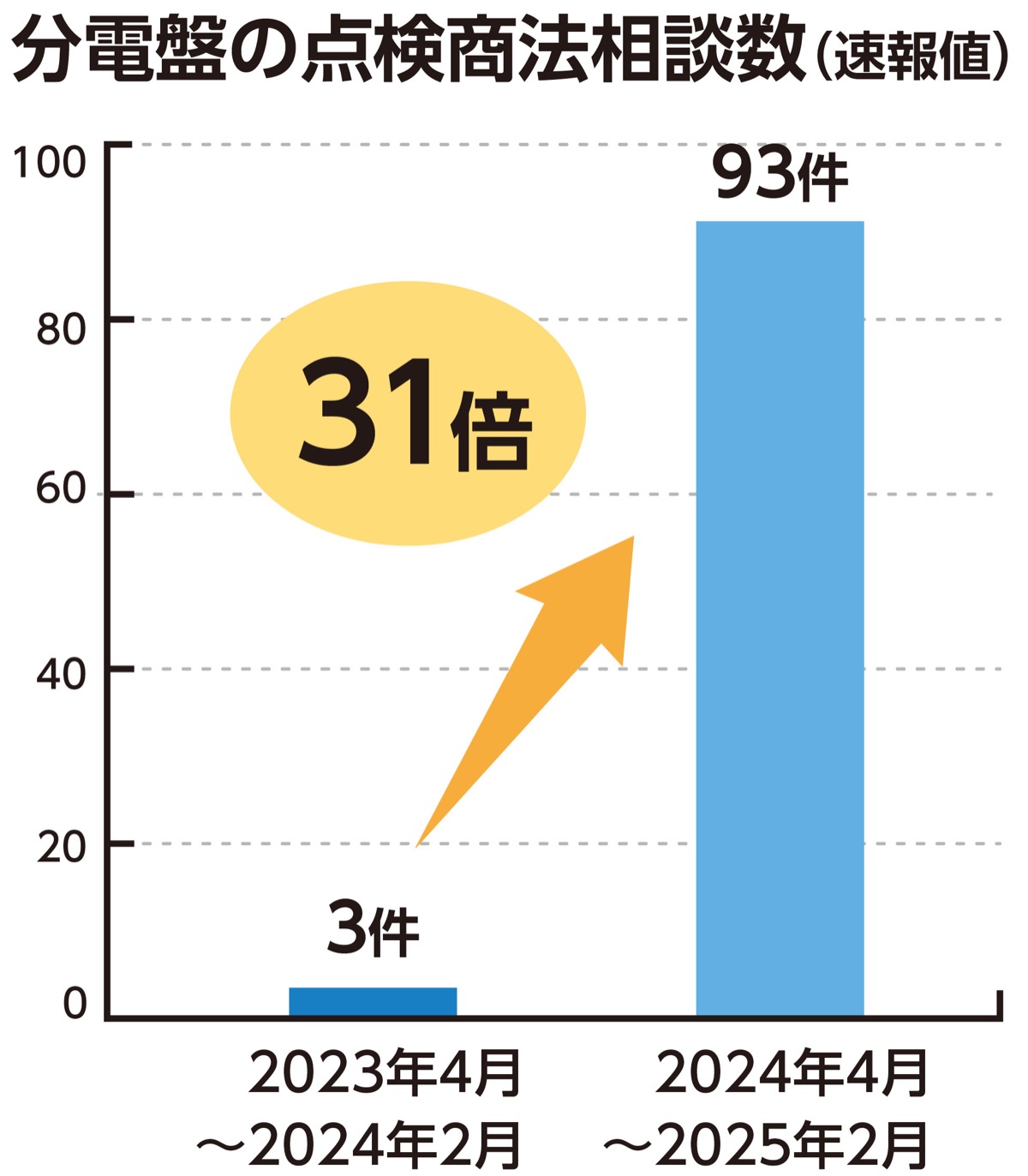 同センターによると2024年4月から2025年2月までの間に776件の「点検商法によって工事契約を持ちかけられた」との相談があり、その内の93件が分電盤に関するものだった。前年度同期は3件だったことから、今年度に入り、大幅に増加している。