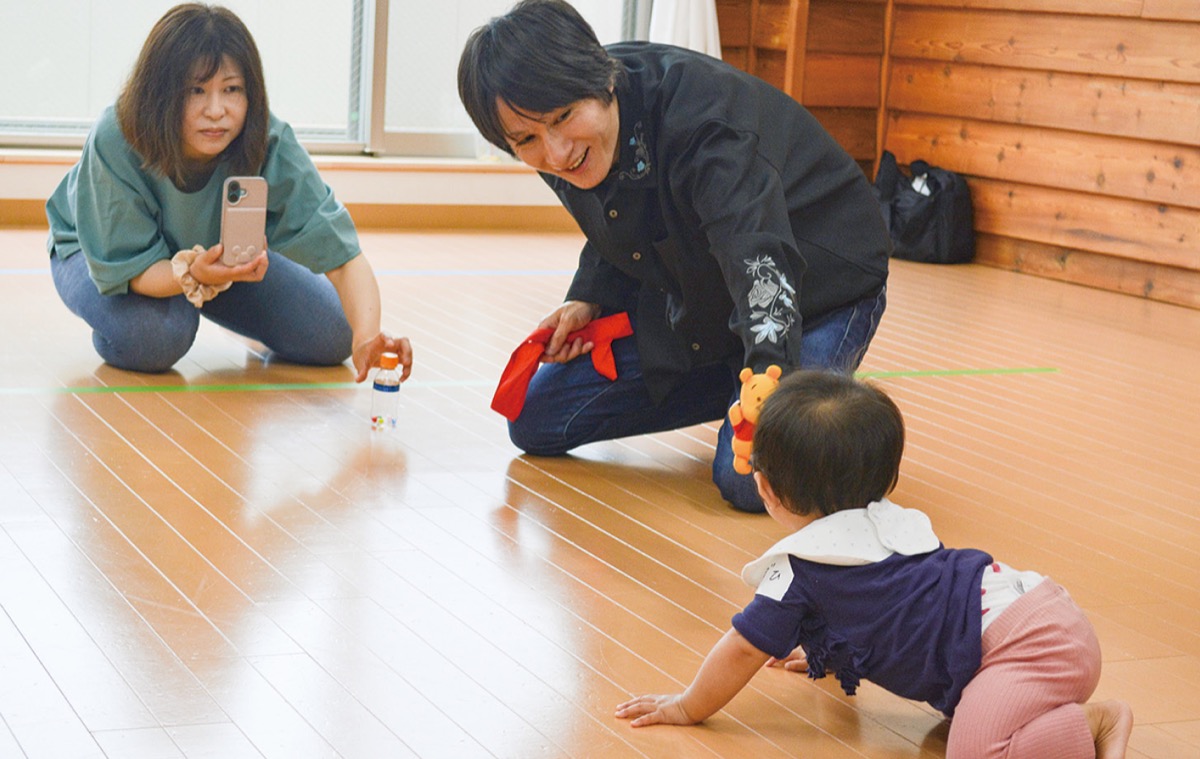 盛り上がりを見せたのが、「ハイハイレース」。これは四つん這いで進む子どもが、母親が待つゴールへの到達を目指す競技で、父親はゴールまでの誘導役を担う。会場内では母親の下へ向かう子どもたちに参加者からの声援が送られた。その後は玉入れが行われ、全競技が終了。生後7カ月の子どもと参加した母親は「週末に子育てイベントを開催している施設は珍しいと思う。夫と参加できてよかった」と笑顔で感想を話した。