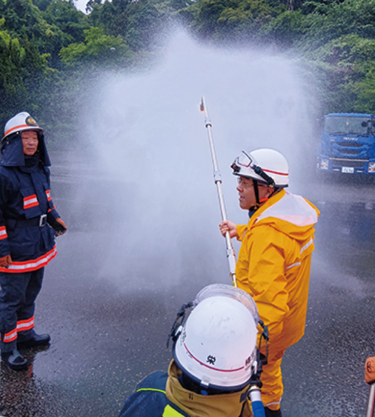 井出消防士長が語った林野火災の特徴は「消火したように見えても木の根が燃焼を続けているなど、地中に見えない炎が残る」こと。そこで訓練には3月に栄署に配備されたばかりのアプリケーターノズルも登場した。これは広範囲に水を撒いたり、地中に突き刺したりすることで、表面にない火の消火に利用できる器具。消防団員がこれを扱うのは初めてで、操作方法の確認を行った。