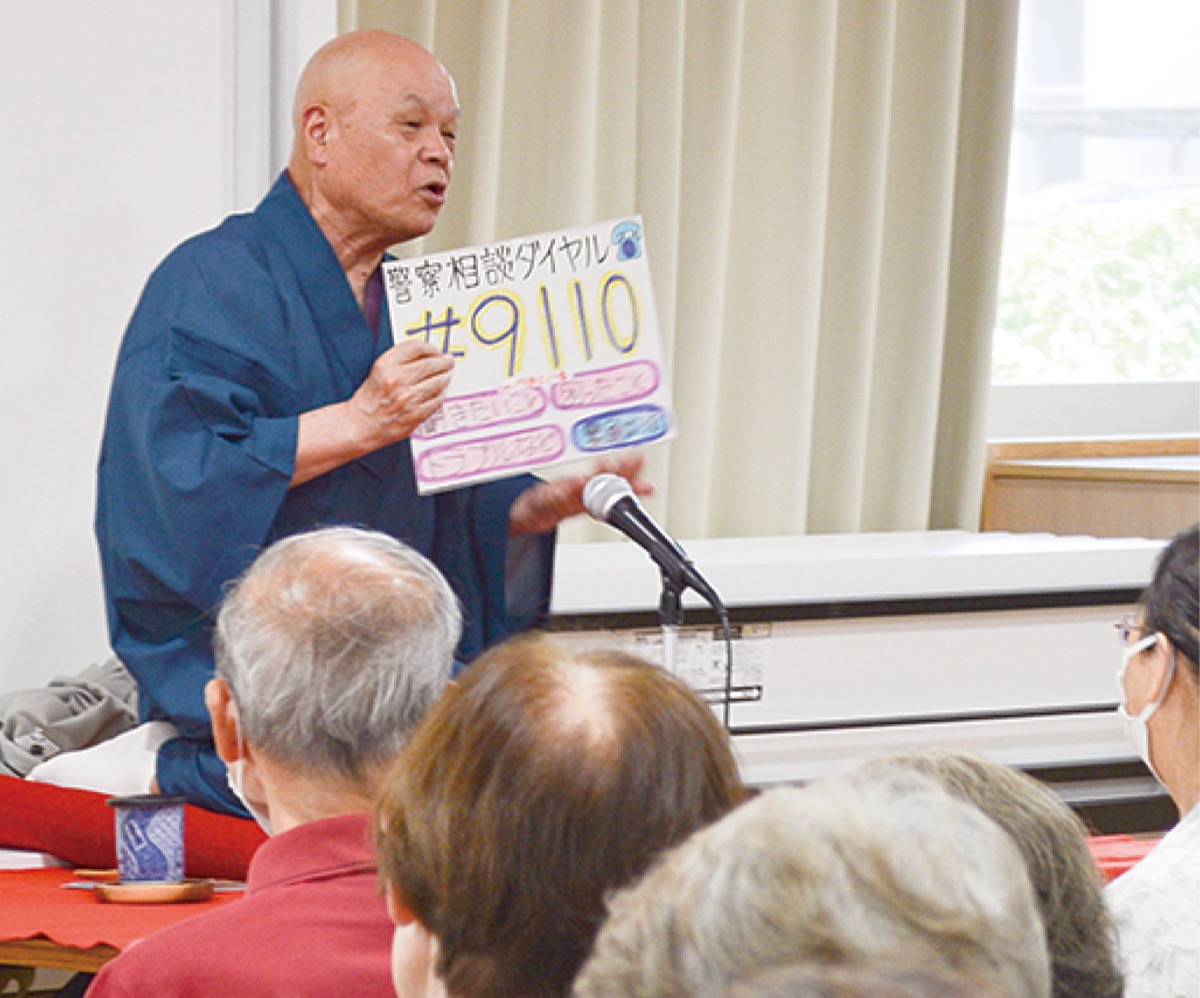 当日は「消費者啓発落語家」の夢見亭わっぱさんが登場。オレオレ詐欺や点検商法における犯人と被害者を一人二役で演じ、注意点などを伝授。また、自作のカードを掲げて「#9110(警察相談専用電話)」や「188(消費者ホットライン)」の利用を呼びかけた。来場者は時折メモを取りながら耳を傾けた。夢見亭わっぱさんは「怪しいと思っても110番するのにハードルを感じる人もいる。そんなときは消費者ホットラインなどに電話して指示を仰いでほしい」と話した。